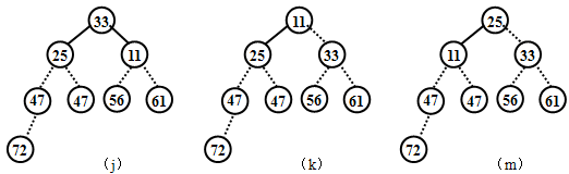 第六步,将第四趟排序的结果除最后4个元素外的其余结点组成的序列调整为堆,如图(h)所示,然后将根结点与倒数第5个结点调换如图(i)所示,完成第五趟排序,第五趟排序的结果为:25 33 11 [47 47 56 61 72]